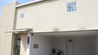 すっきりとしたシンプルなデザインの建物です。一階部分には、駐車スペースを設けています。