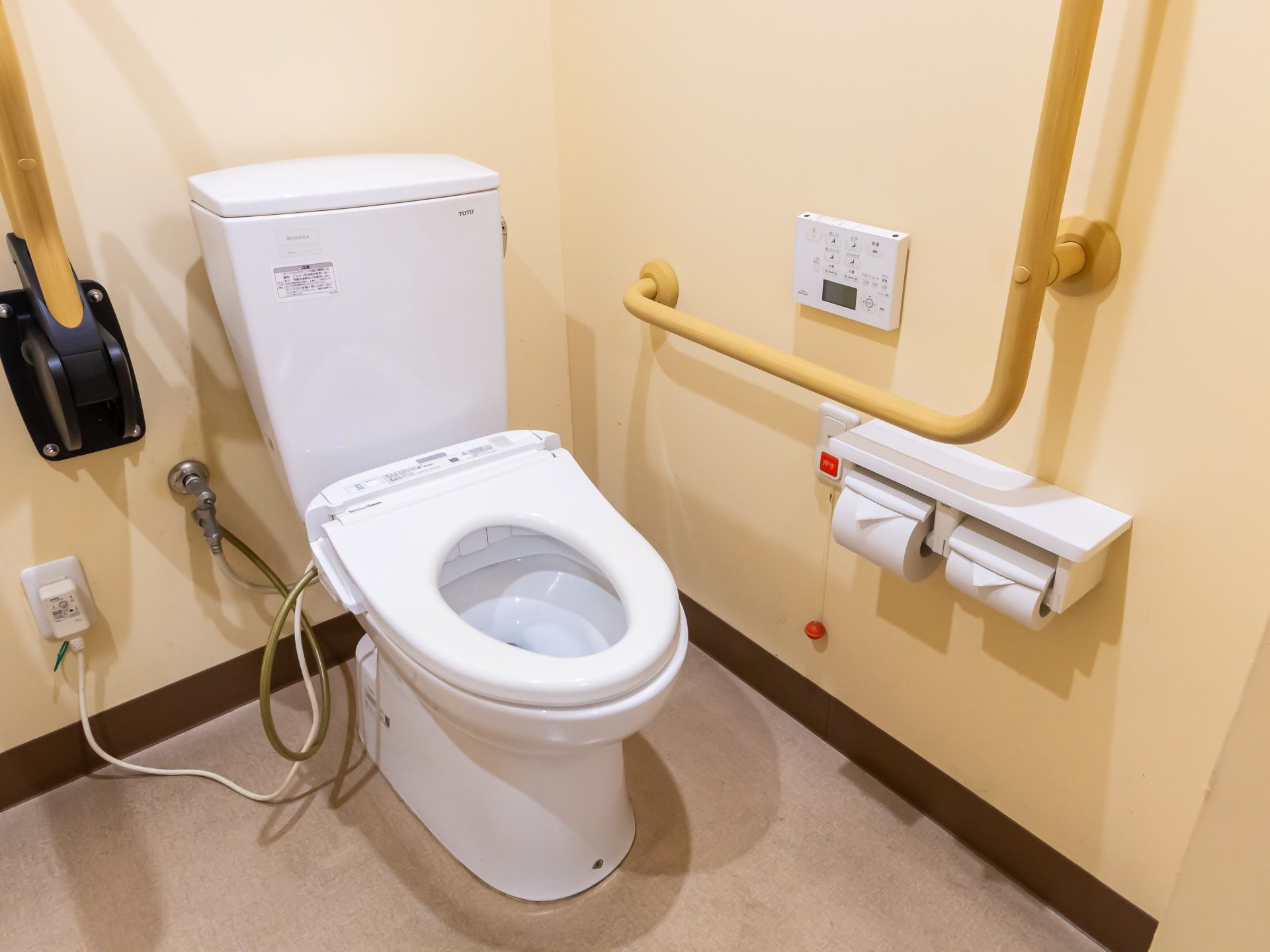 手すりが設置されたトイレで、安心してご利用いただけます。操作パネルも使いやすい位置にあります。