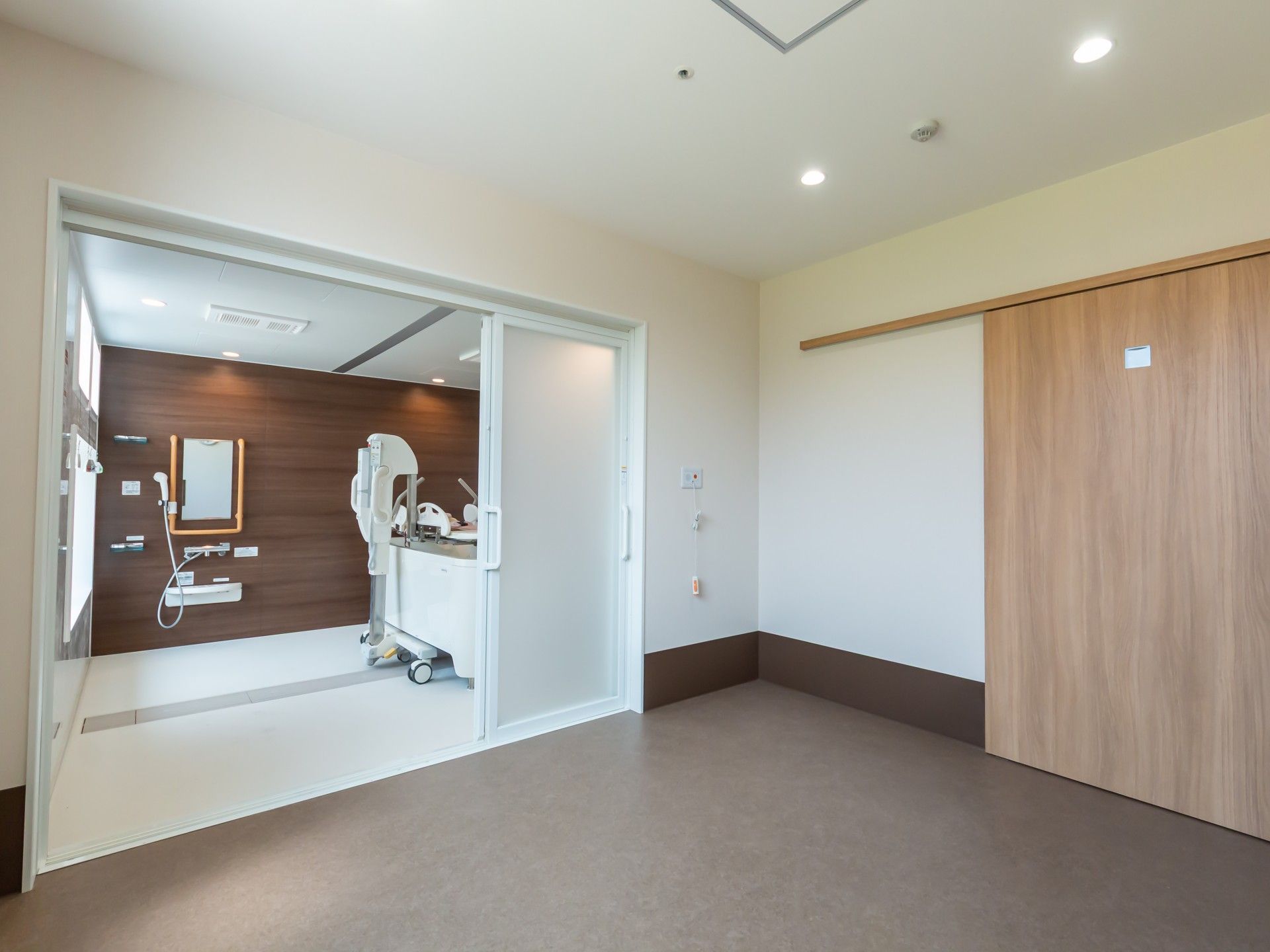 浴室は広く、車椅子でも安心してご利用いただけます。居室との行き来もスムーズです。