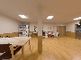 明るい空間で、テーブルと椅子が整然と配置されています。リラックスしながら過ごせる場所です。