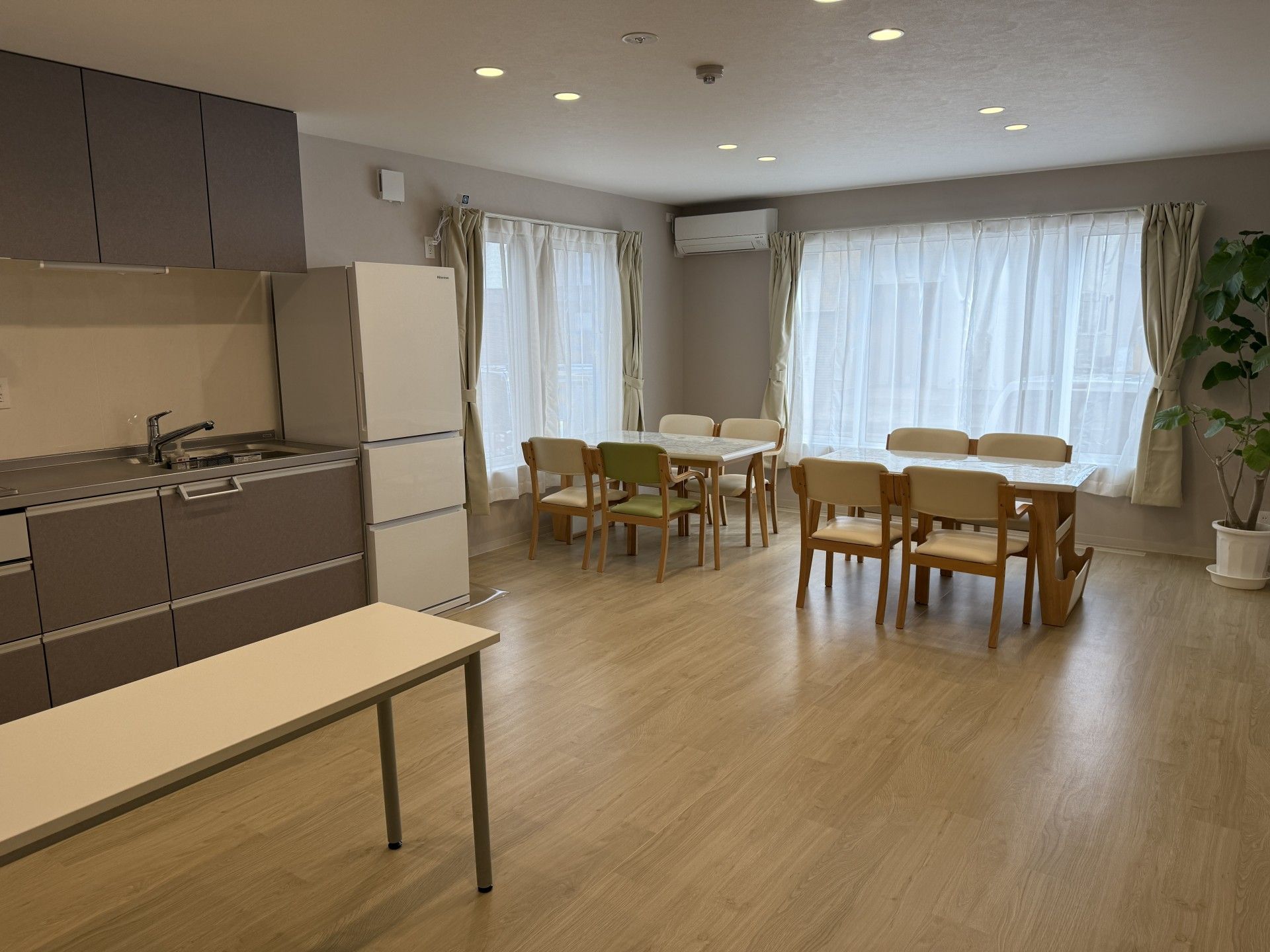 一部の住宅では大型浴室や共同キッチン、食堂を完備し、ご入居者様同士の交流の場としてご活用いただけます。朝食・夕食の食事サービスもご用意しており、栄養バランスの取れた食事をご提供いたします。共有部分の清掃は当番制でスタッフと一緒に行うなど、ご入居者様の自主性を尊重しながらも協力し合える環境づくりを大切にしています。エレベーターを備えた住宅もあり、移動の負担を軽減する配慮もしております。安心と自立のバランスを大切にした生活環境で、充実した毎日をお過ごしいただけます。