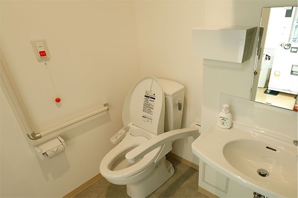 • トイレ 手すり付きで安心して利用できるトイレです。緊急時には呼び出しボタンも備えています。