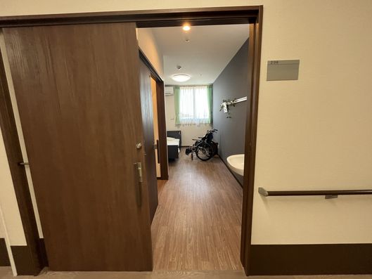 手すり付きのスロープが整備された入口です。安全に配慮された設計で、ご高齢の方も安心してお過ごしいただけます。