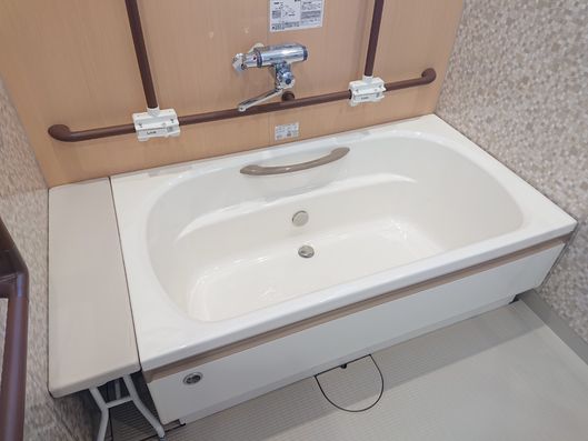 ホームの1階と2階、両方に浴室がございます。1階の浴槽にはキャリーチェアを用意しているため、車いすの方でも安心してご入浴していただけます。複数の手すりも設置されており、安心安全に入浴できるように配慮されています。
