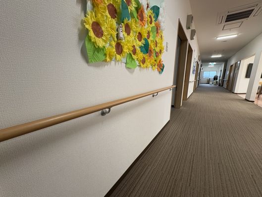 手すりが設置された廊下は、移動がしやすく安心です。居室の扉も広く、出入りが快適です。