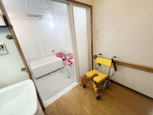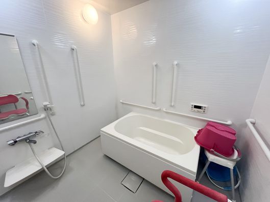 お一人ずつご入浴いただける個浴室。上下に手すりが付き、背の高さにかかわらずご入居者様を支えることができるようになっております。