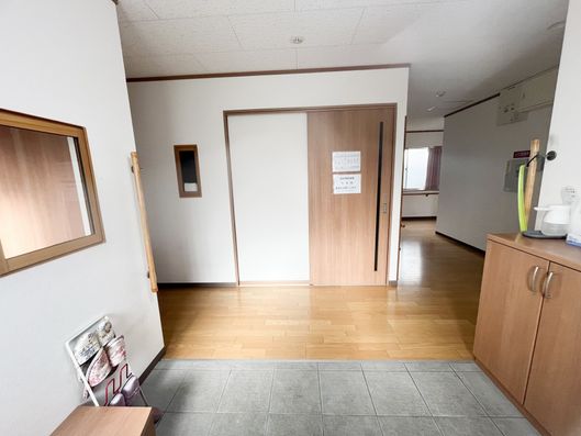 車いすをご利用の方も安全に出入りができる玄関。土間スペースと館内のフロアのデザインや色を変えることで、認識していただけるよう工夫しております。