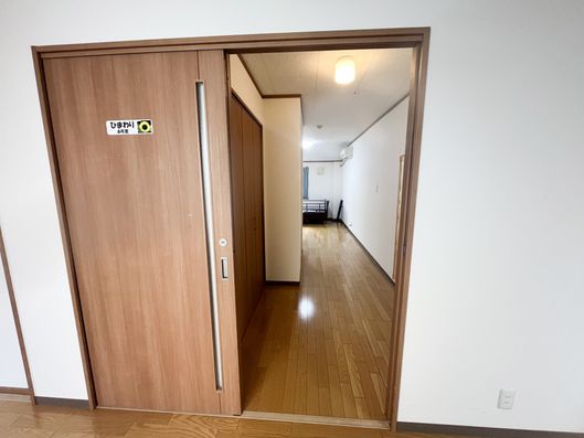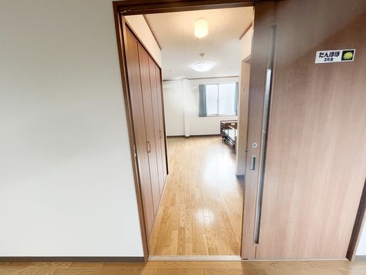 まっすぐな廊下には手すりが付き、ご入居者様の移動をサポート。居室のドアは引き戸で、開け閉めのしやすいデザインです。