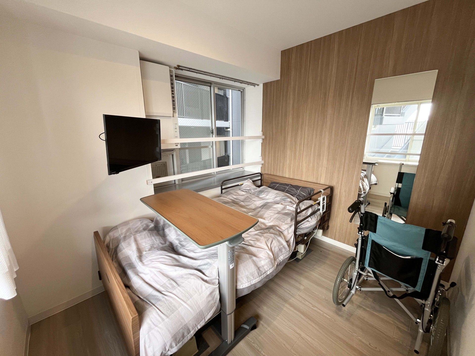窓からの自然光が心地よい空間です。ベッドの横には車椅子があり、移動も安心です。