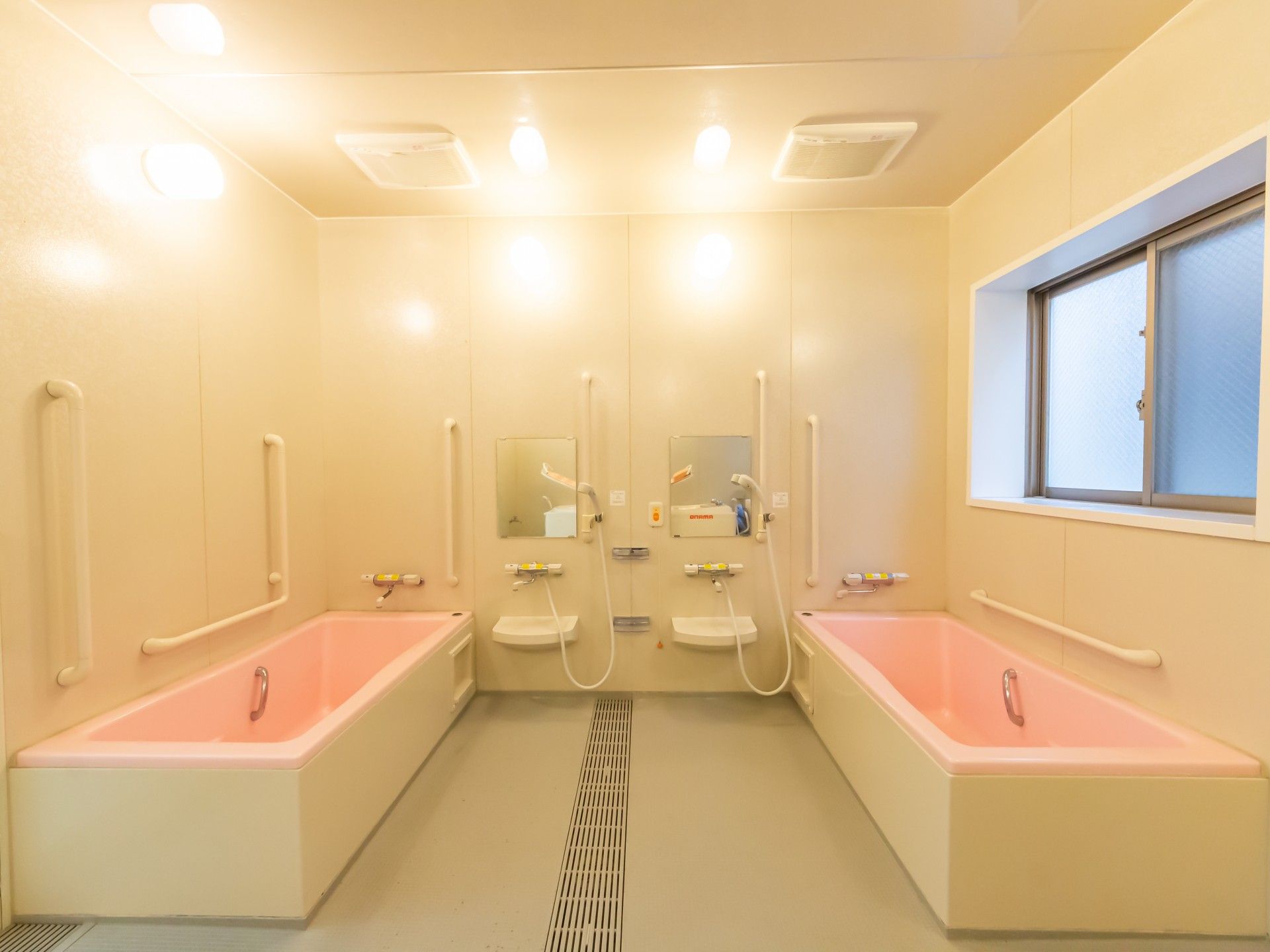 手すりが設置された浴室で、安心して入浴を楽しめます。明るい照明が心地よい空間を作ります。