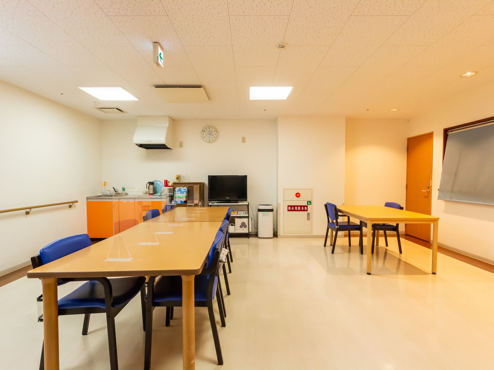 広いテーブルと椅子が並び、皆で集まって楽しい時間を過ごせる場所です。