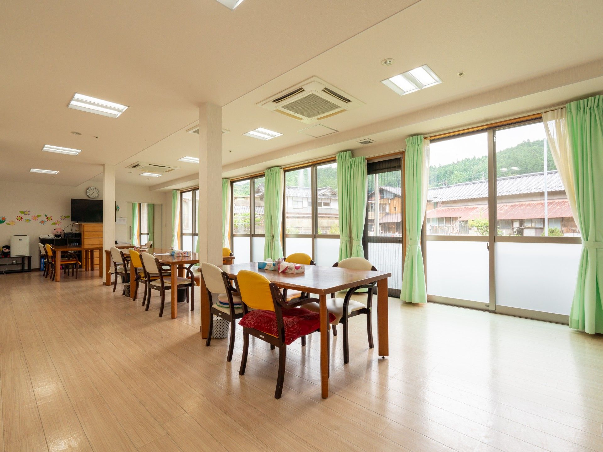 大きな窓から自然光が差し込み、色とりどりの壁飾りが明るい雰囲気を演出しています。