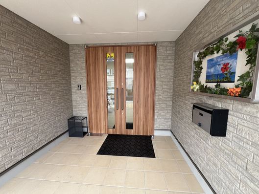 清潔感のある外観の建物です。バリアフリー設計で、どなたでも安心してお過ごしいただける環境を整えています。