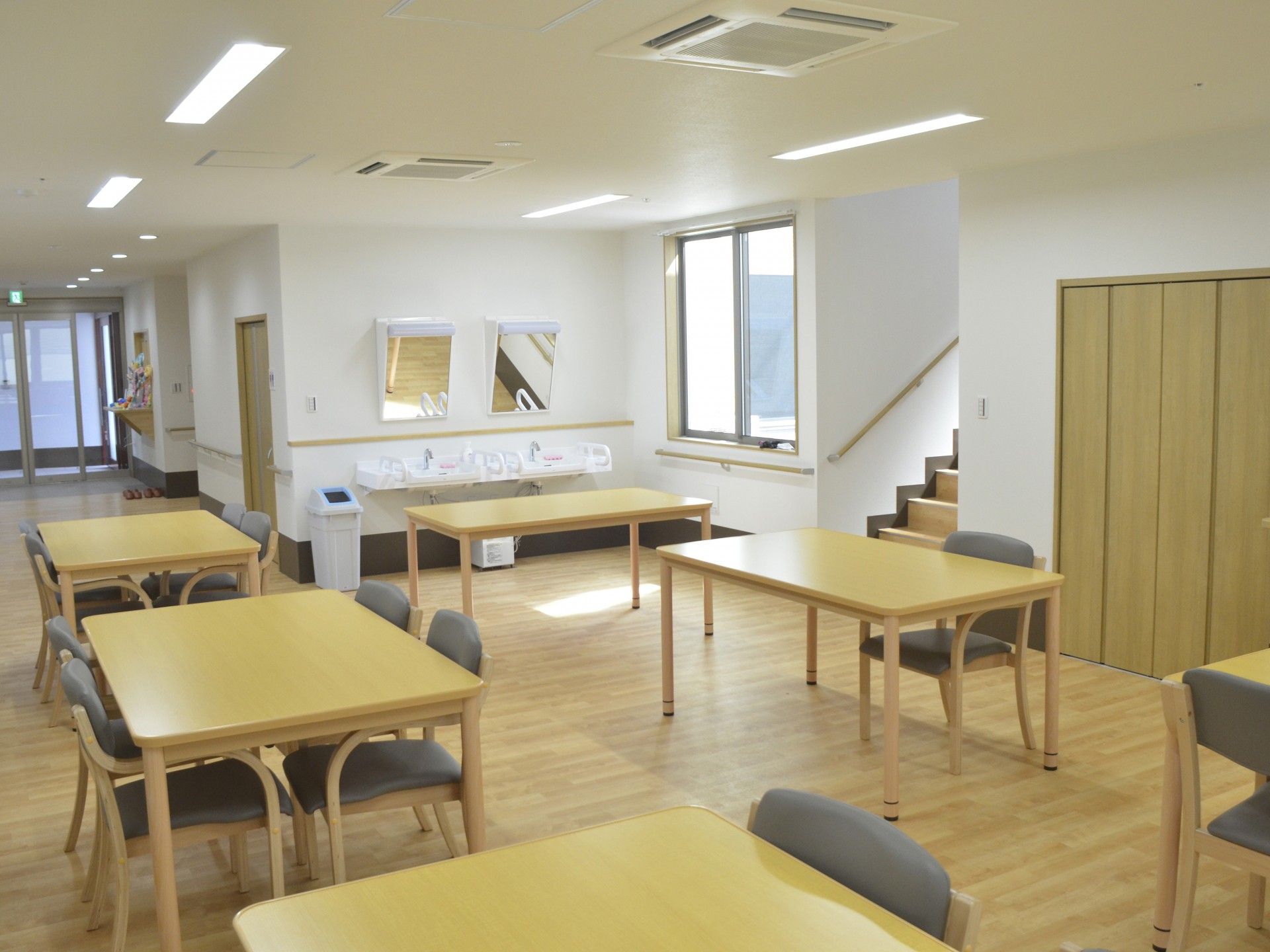 大きな窓から自然光が差し込む、開放的な空間です。テーブルと椅子が配置され、交流の場として最適です。