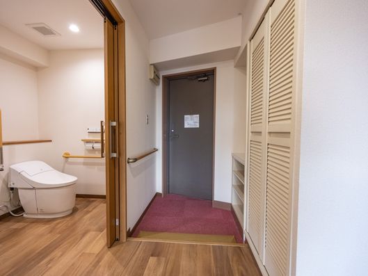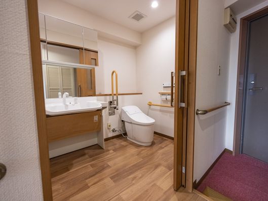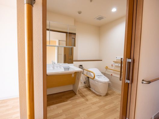 手すり付きで安全に配慮されたトイレ空間です。ご自身での利用がしやすいよう工夫がされており、安心してお過ごしいただけます。
