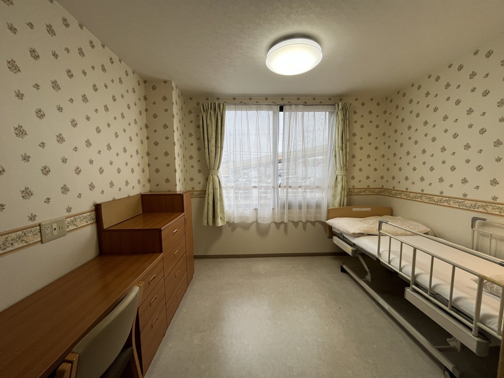 窓からの自然光が心地よい空間です。ベッドと机が配置され、日常生活を快適に過ごせます。