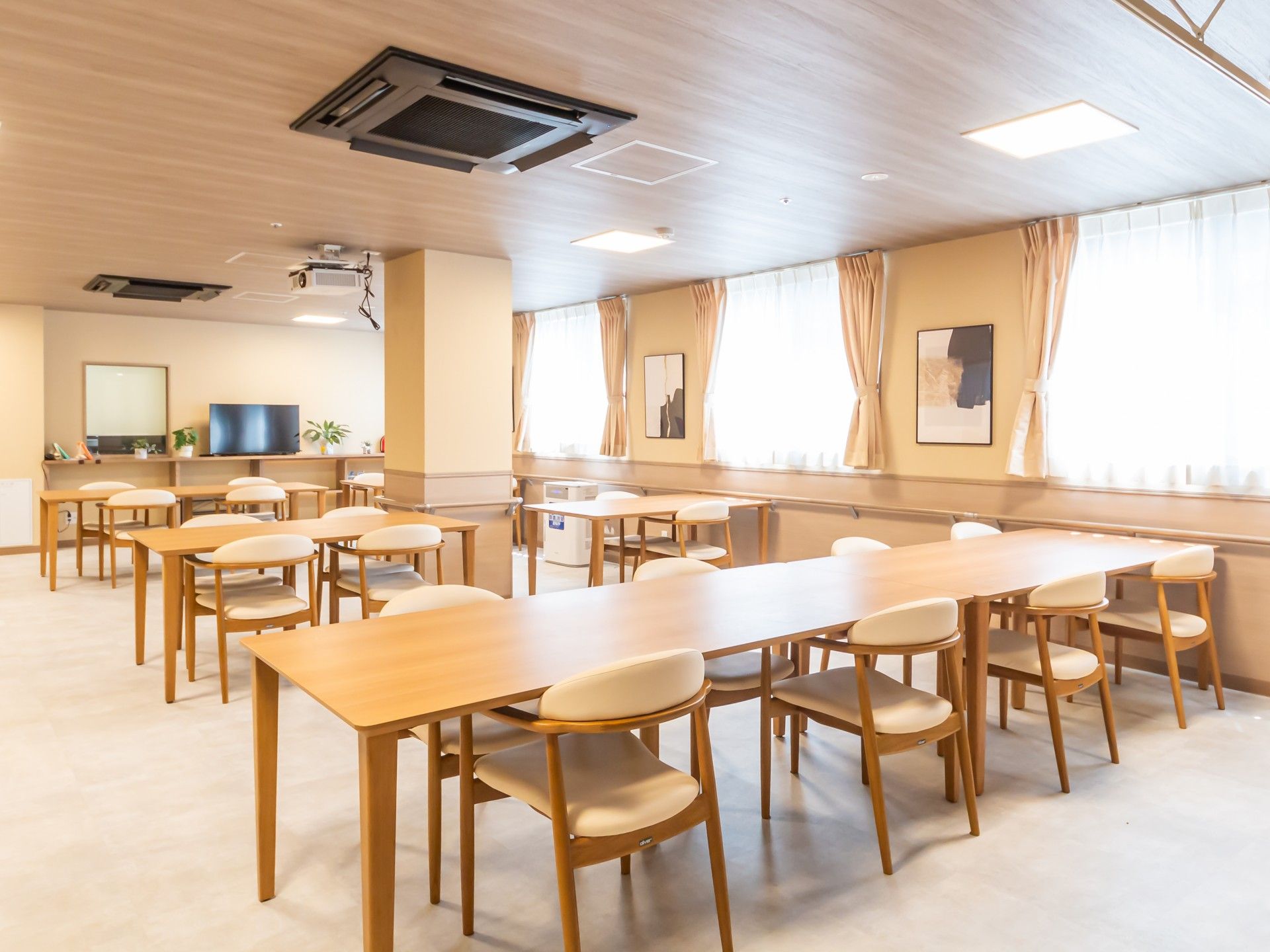 広々とした明るいダイニングで、お食事や交流をお楽しみいただけます。清潔感あふれる空間が、心地よい時間を約束します。