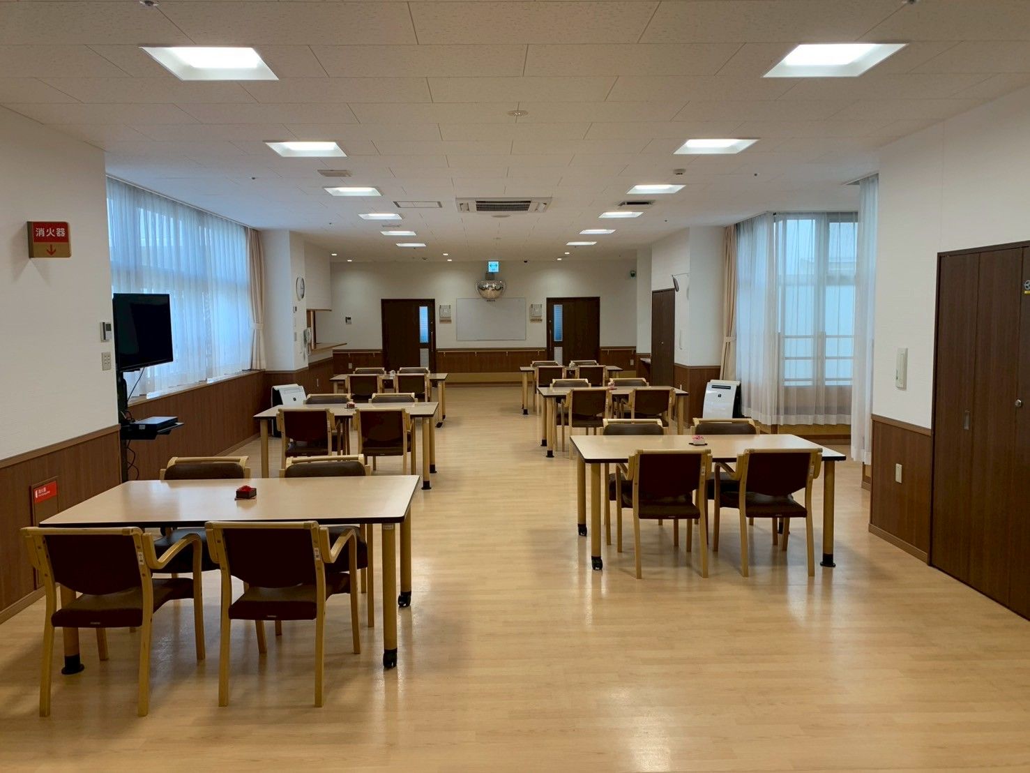 食堂兼リビングは広々とした開放的な空間で、ゆったりとお過ごしいただけます。談話コーナーではご家族様との面会や入居者様同士の交流の場としてご利用いただけます。季節を感じる行事を年間を通して実施しており、春のお花見、夏祭り、秋のお彼岸、冬のクリスマス会など四季折々のイベントをお楽しみいただけます。料理教室や編み物、フラワーアレンジメントなどの製作活動も充実しています。栄養士と調理員が考案した栄養バランスの取れた食事は、きざみ食やミキサー食など個別の対応も可能です。