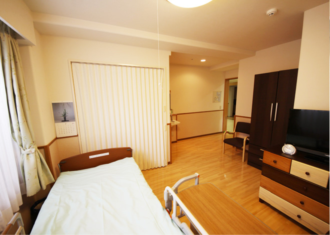 • 居室 窓からの自然光が心地よい個室です。ベッド横には椅子があり、訪問者との会話も楽しめます。
