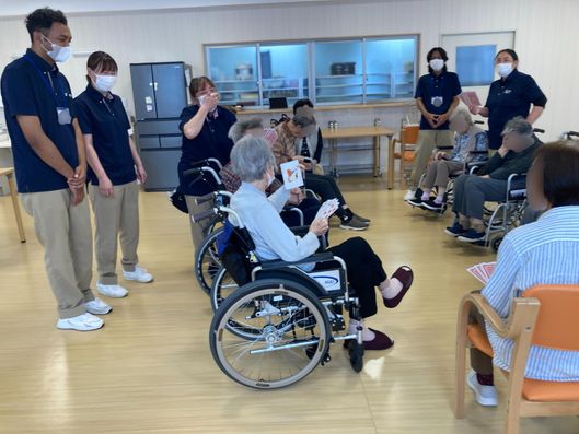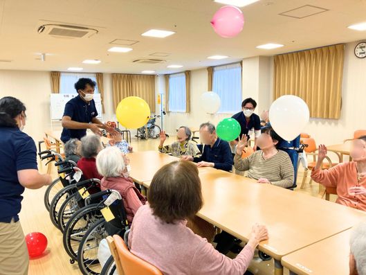 毎日レクを行っています。体操を始め、お散歩に行ったり、風船バレーやかるた、わなげ、脳トレ、などなど。また、地域のボランティアの方々が歌や楽器を披露しに来てくださいます。月ごとのイベントもあり、誕生日会や納涼祭、節分、そば打ち等様々なレクを実施しています。