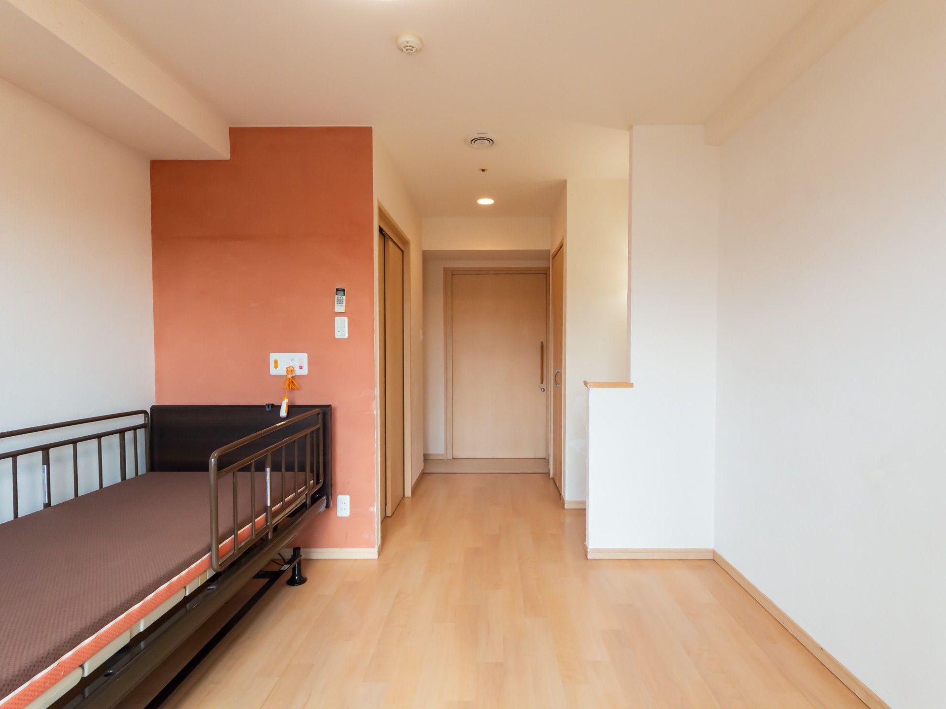 要支援1から要介護5まで幅広く受け入れ、認知症の方も入居可能です。全41室の居室は18.48㎡~31.02㎡の広さを確保し、すべての居室にトイレ、洗面台、エアコン、照明器具を標準装備しています。居室内にはベッド付近とトイレ内に緊急通報装置を設置し、急な体調変化にも対応可能です。居室は大きな窓から自然光が差し込み、快適な空間となっています。収納スペースのある洗面台も設置され、プライバシーを重視した生活環境をご提供いたします。