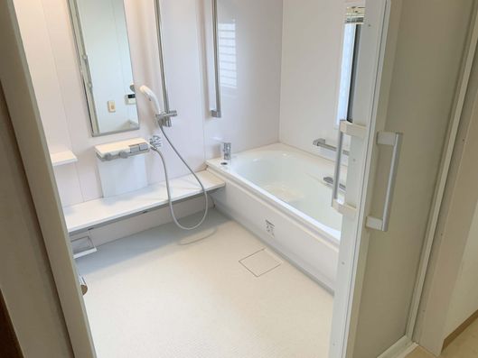 安全に配慮した手すりが設置された浴室です。座れる椅子もあり、安心してご利用いただけます。