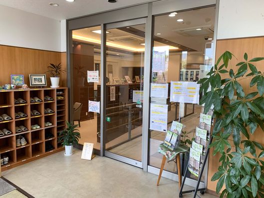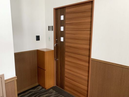 木目調の天井とガラス扉が、訪れる方を温かく迎え入れるエントランスです。