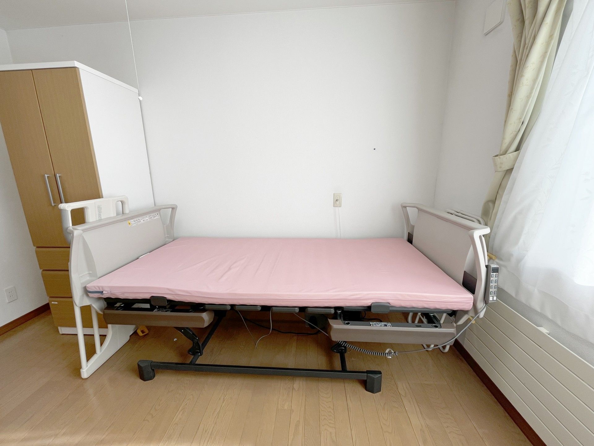 電動ベッドが設置されたお部屋です。リモコン操作で簡単に調整でき、快適にお過ごしいただけます。