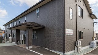 グレーの外壁がシックでモダンな印象の、一軒家風の建物です。玄関前はスペースを設けておりますので、お車で近くまでお越しいただけます。