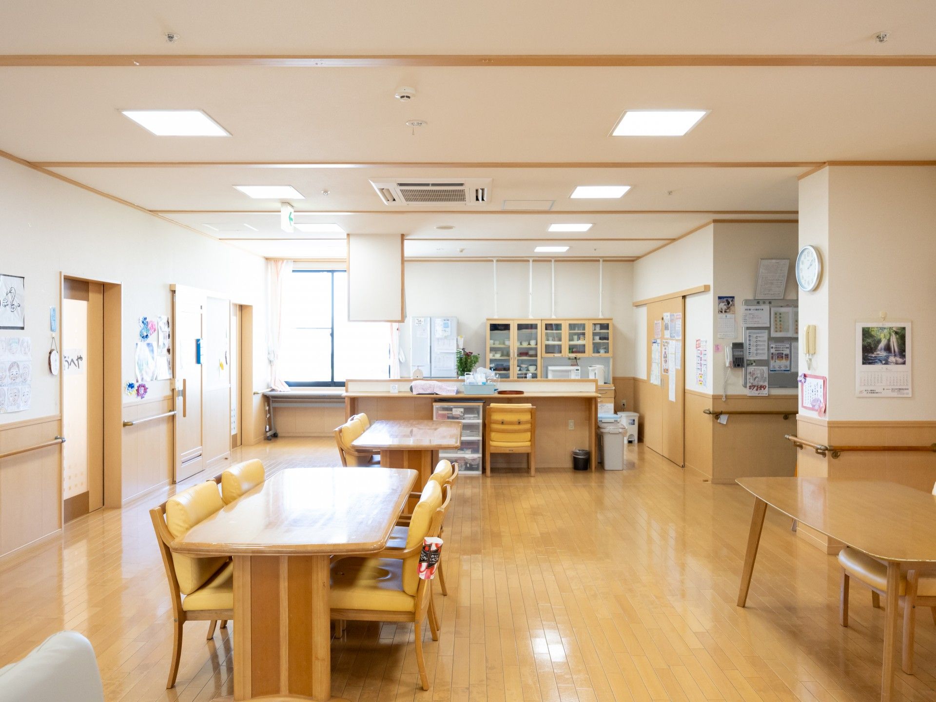 • 食堂 広々としたテーブルが並び、皆さんで楽しく過ごせる空間です。壁には季節の飾りが彩りを添えています。