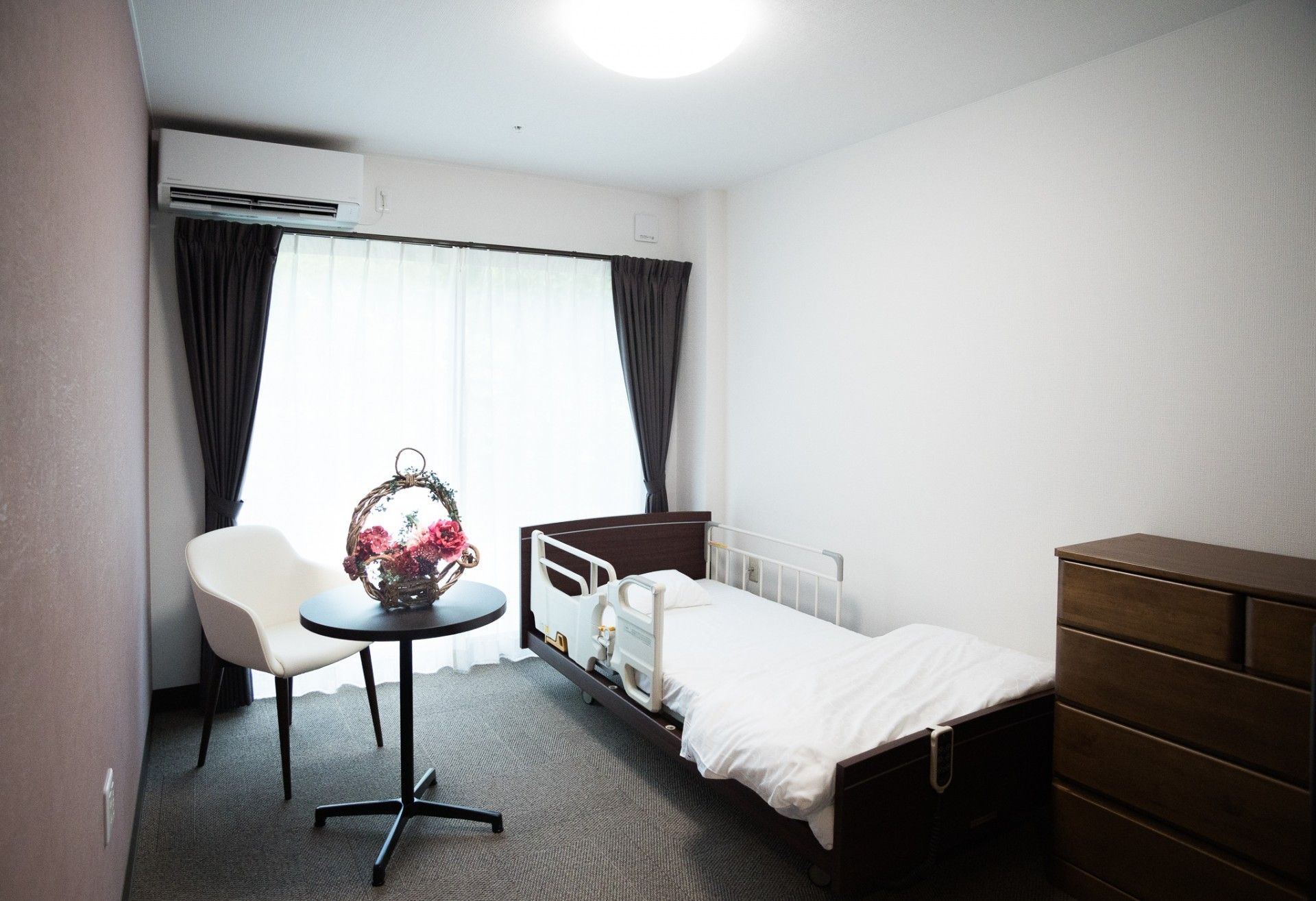 • 居室 窓からの自然光が心地よい空間です。ベッド横にはテーブルと椅子があり、くつろぎの時間をお過ごしいただけます。