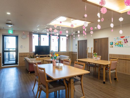 桜の飾りが映える居心地の良い共有スペースです。ゆったりとした時間を過ごしながら、コミュニケーションも楽しめます。