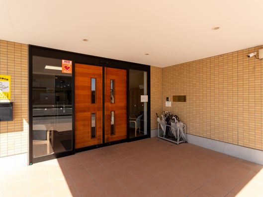 広々としたエントランスは日差しが心地よく、手すりや車椅子用スペースも完備しております。安心してお過ごしいただける環境です。