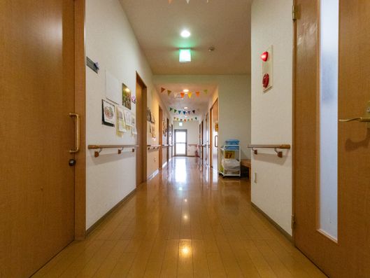 手すりが設置された明るい廊下です。壁に飾られた絵やガーランドが、温かな雰囲気を醸し出しています。