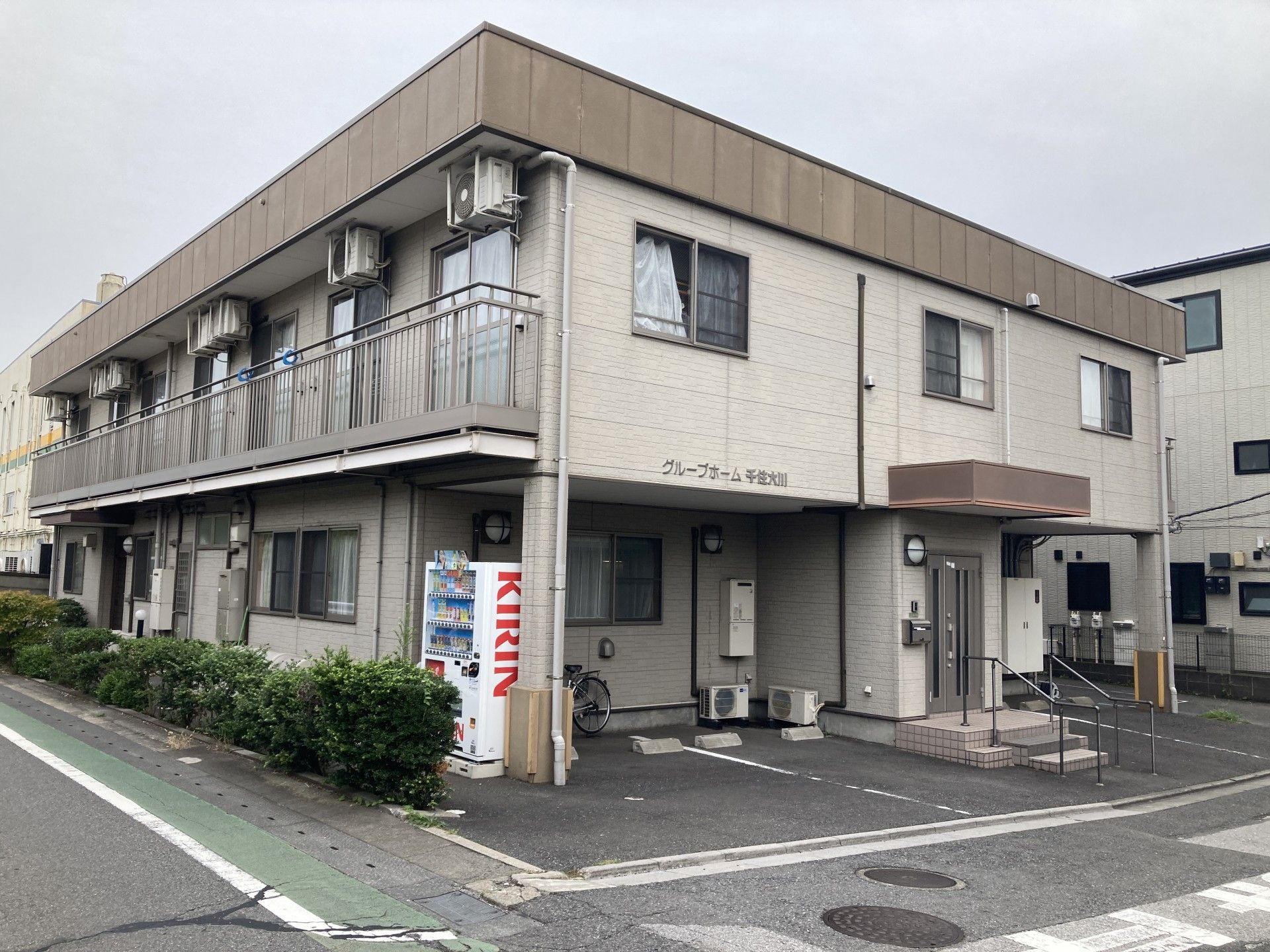 建物の前には自動販売機があり、飲み物を手軽に購入できます。外出せずに便利に利用可能です。