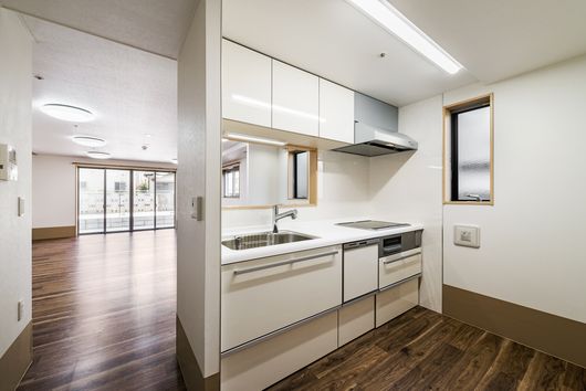 リビングの天井にはコンセントの差し込み口があり、小型IHヒーターを使用して料理やおやつ作りに全員が参加できる環境を整えています。家庭用と同じサイズの台所は、ご家庭に近い形を理想とするグループホームにちょうどいい大きさです。ご入居者様が食器を洗ったりする家事活動も可能な設計となっています。共用トイレは6ヶ所、浴室は2ヶ所設置しており、快適に共同生活を送っていただけます。季節のイベントや日常的な活動を通じて、生活の喜びを感じていただける環境づくりに努めています。