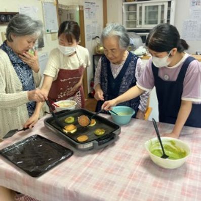 ご入居者様が召し上がるお食事は毎食専門スタッフの手で調理されております。お一人お一人のご入居者様のお体の状況や嗜好に合わせて調整できるということも、少人数のホームならではのメリットです。食卓にはスタッフも一緒について同じメニューをいただきます。ご自宅のようにみんなで会話を楽しみながら食事する、いつもにぎやかな食卓です。