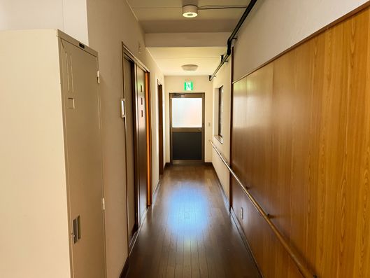 手すりが設置された温かみのある廊下です。歩行に不安がある方も、安心してお過ごしいただけます。