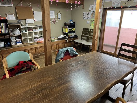 木のぬくもり感じる共有スペースです。壁に飾られた絵や工作品が、日々の楽しい活動を物語っています。