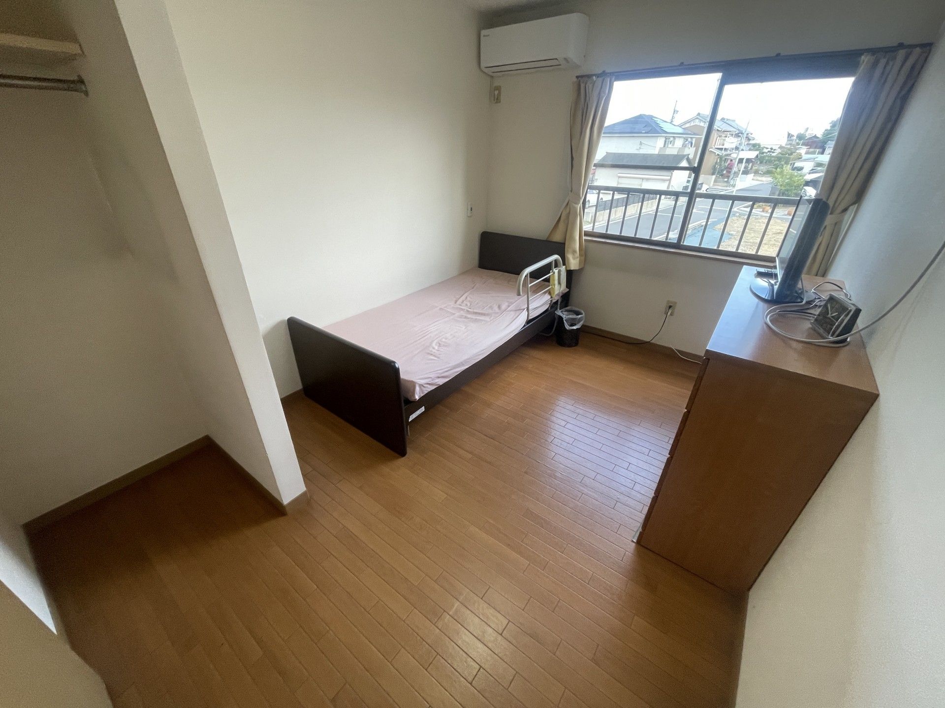 窓からの自然光が心地よく差し込むお部屋です。ベッドと収納があり、快適に過ごせます。