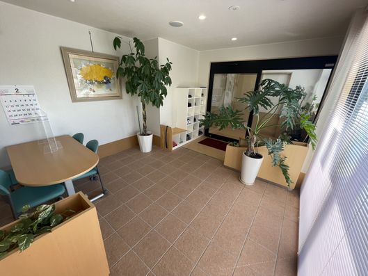 ゆったりとした椅子が並ぶ待合室です。窓からの自然光が心地よい空間で、ご家族の訪問をお待ちいただけます。