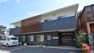 2階建ての、落ち着いた色味の外観です。嵐山の自然を感じられる立地です。
