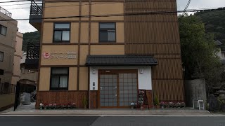 建物の入口にはたくさんの植木鉢に花が植えられています。外壁は木の格子のデザインや漆喰など町屋の雰囲気を醸し出しています。