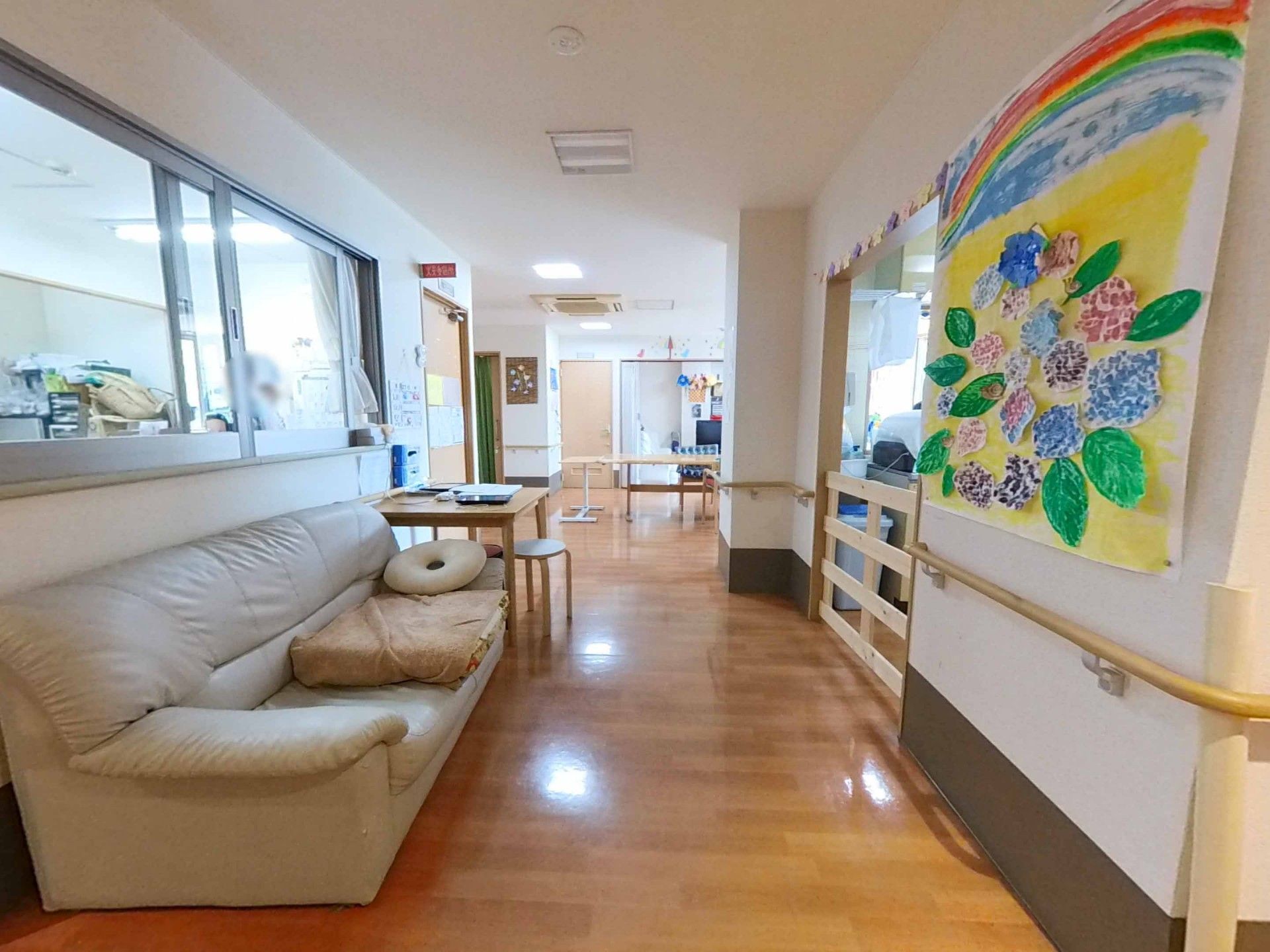 壁には季節の飾りが並び、温かみのある空間です。手すりが設置されており、安心して歩けます。