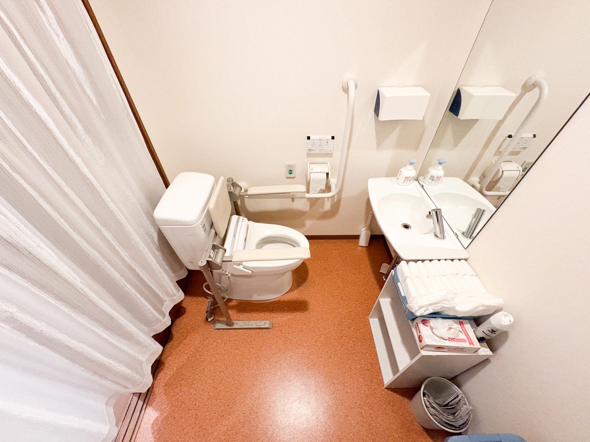 手すりが設置されたトイレは、安全に配慮されています。洗面台も近く、使いやすい設計です。
