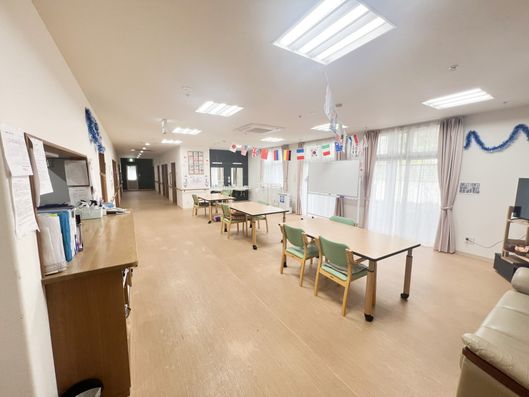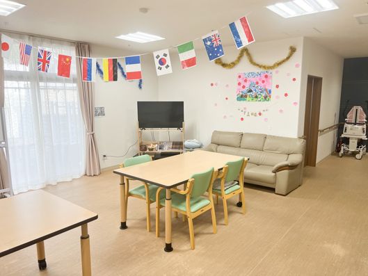 国旗が彩る広々とした活動室です。様々なイベントや交流が楽しめる空間が整っており、充実した日々を送れます。