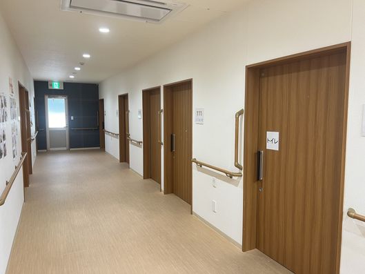 手すりが設置された廊下は、ゆったりとした歩行スペースを提供しており、安心してお過ごしいただけます。壁には色とりどりのアートが飾られ、温かみのある雰囲気を演出しています。