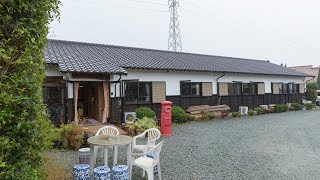 • 正面に和風の平屋建てのホームが建っている。ホームの左手には緑の木々が植えられていて、近くにテーブルや椅子などが並べられている。