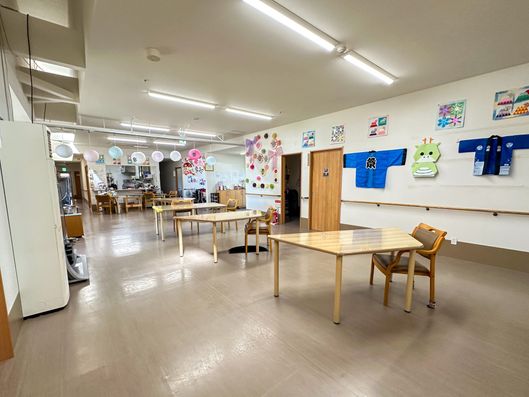 ゆったりとした空間でのびのびと過ごせる共有スペースです。カラフルな装飾が心を和ませ、様々な活動が楽しめそうです。