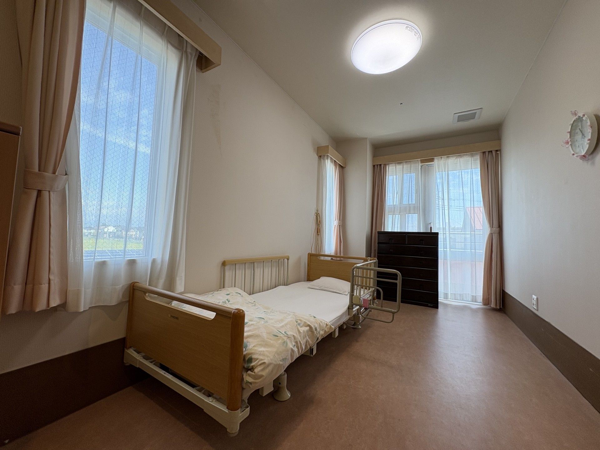 窓からの自然光が心地よく差し込む個室です。家具も整い、快適にお過ごしいただけます。